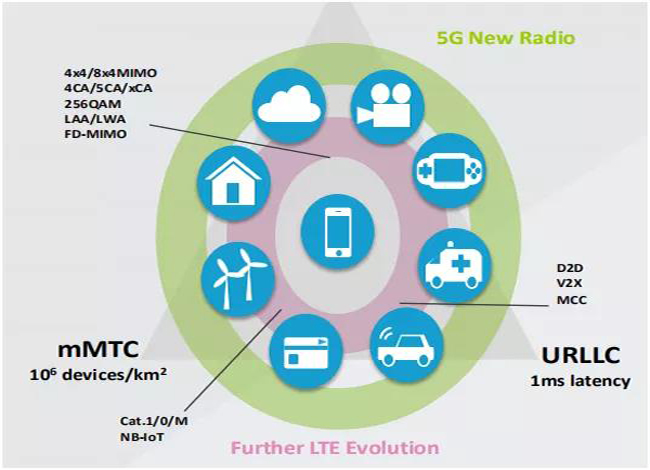 mMTC低功耗大连接:面向智慧城市、环境监测、智能农业、森林防火等以传感和数据采集为目标的应用场景,具有小数据包、低功耗、海量连接等特点。要求网络满足100万/km2连接数密度指标要求,保证终端的超低功耗和超低成本,大规模物联网业务,实现从消费到生产的全环节、从人到物的全场景覆盖,万物互联,1GHz以下频段。