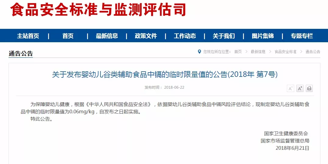 值得注意的是,国家卫健委还发布了关于婴幼儿谷类辅助食品中镉的临时限量值的公告。依据婴幼儿谷类辅助食品中镉风险评估结论,制定婴幼儿谷类辅助食品中镉的临时限量值为0.06mg/kg。