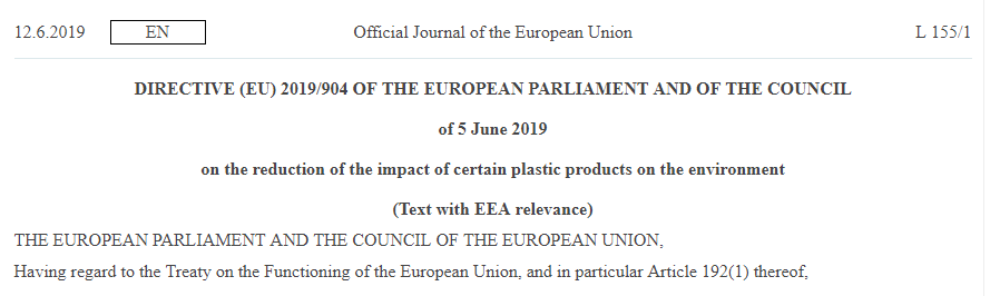 2019年6月12日,欧盟官方公报发布指令(EC)2019/904,限制一次性塑料及制品,以防止和减少某些塑料产品对环境和人类健康的影响。该指令直接作用于成员国,将于2019年7月1日起生效。